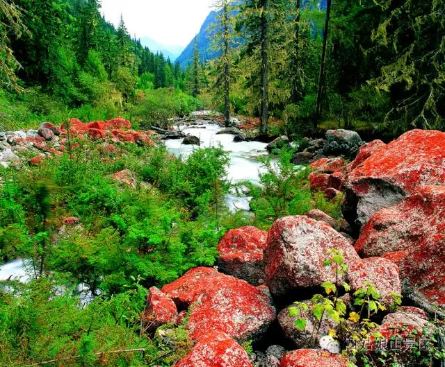 一堆红石散落在青葱的树林草丛之中。相传在很久以前,阿巴朗依化作山峰以后,四姑娘悲痛欲绝,哭着奔向父亲的遗体,她的眼泪流干了,血从她的眼睛里流了出来,染红了这片石头。